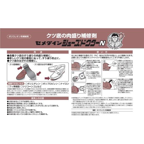 Worn out shoe sole can be easily repaired.Less odor solvent-free type.For overlay repairing and adhesion of peeling of shoe soles.Color:BrownCapacity (ml):50Principal Component: Polyurethane ResinSpatula, poly plate for repairing, sand paper