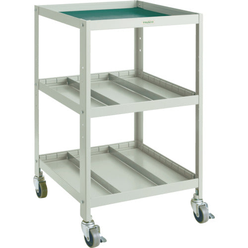 The top board has a mat.Max Load Capacity (kg/piece):60Shelf Board:20Equal Load Capacity (kg/stage) Drawer:-W x D x H (mm):510 x 535 x 896Number of Stages (stage):3Caster: Flexible Type 75mm(2 pieces), Flexible Type(with stopper)75mm(2 pieces)Shelf Board: Upper Shelf Board with Fall Prevention(vinyl mat protection), Middle and Bottom Shelf Board with Fall Prevention(with partition panel)Fall Prevention Height: 40mmShelf Board Adjustable Pitch: 50mmMain Body: Steel(melamine baked coating)Caster Bracket: SteelWheel: UrethanePartition Panel: Shelf Board with Partition (2 sheets per sheet)