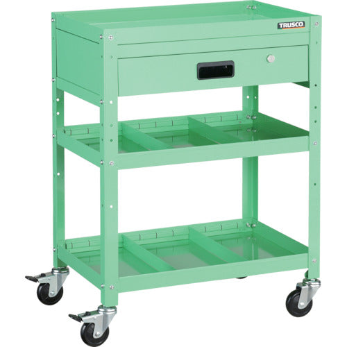 A double lock specification caster which locks the axle with the wheel.Max Load Capacity (kg/piece):150Equal Load Capacity (kg/stage):50Color:Young GreenW x D x H (mm):600 x 400 x 810Number of Stages (stage):3Drawer(stage):1Caster: Flexible Type 75mm(2 pieces), Flexible Type(with double stopper)75mm(2 pieces)With keyVertical Partition x 4Shelf Board: Steel(melamine baked coating)Strut: Steel(baked coating)Caster Bracket: Steel(chrome-plated finishing)Wheel: Rubber