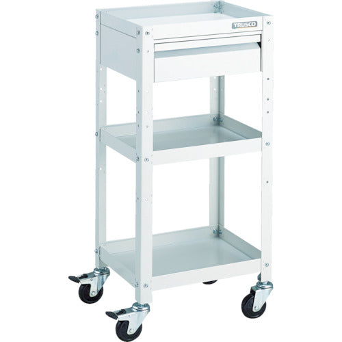 A double lock specification caster which locks the axle with the wheel.Max Load Capacity (kg/piece):150Equal Load Capacity (kg/stage):50Color:WhiteW x D x H (mm):400 x 350 x 880Number of Stages (stage):3Drawer(stage):1Caster: Flexible Type 75mm (2 pieces) Flexible Type (with double stopper) 75mm (2 pieces)Shelf Board: Steel(melamine baked coating)Strut: Steel(baked coating)Caster Bracket: Steel(chrome-plated finishing)Wheel: Rubber