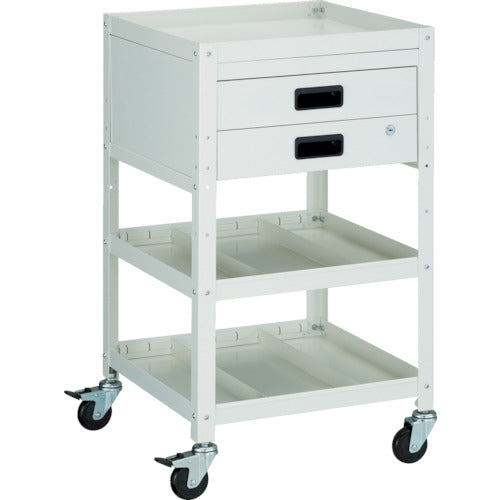 A double lock specification caster which locks the axle with the wheel.Max Load Capacity (kg/piece):150Equal Load Capacity (kg/stage):50Color:WhiteW x D x H (mm):500 x 500 x 880Number of Stages (stage):3Drawer(stage):2Caster: Flexible Type 75mm(2 pieces), Flexible Type(with double stopper)75mm(2 pieces)With keyVertical Partition x 4Shelf Board: Steel(melamine baked coating)Strut: Steel(baked coating)Caster Bracket: Steel(chrome-plated finishing)Wheel: Rubber