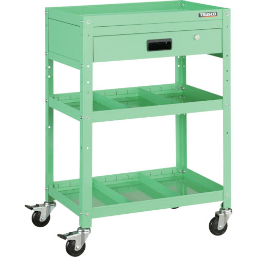 A double lock specification caster which locks the axle with the wheel.Max Load Capacity (kg/piece):150Equal Load Capacity (kg/stage):50Color:Young GreenW x D x H (mm):600 x 400 x 880Number of Stages (stage):3Drawer(stage):1Caster: Flexible Type 75mm(2 pieces), Flexible Type(with double stopper)75mm(2 pieces)With keyVertical Partition x 4Shelf Board: Steel(melamine baked coating)Strut: Steel(baked coating)Caster Bracket: Steel(chrome-plated finishing)Wheel: Rubber