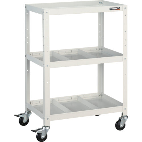 A double lock specification caster which locks the axle with the wheel.Max Load Capacity (kg/piece):150Equal Load Capacity (kg/stage):50Color:WhiteW x D x H (mm):600 x 400 x 880Number of Stages (stage):3Caster: Flexible Type 75mm(2 pieces), Flexible Type(with double stopper)75mm(2 pieces)Vertical Partition x 4Shelf Board: Steel(melamine baked coating)Strut: Steel(baked coating)Caster Bracket: Steel(chrome-plated finishing)Wheel: Rubber