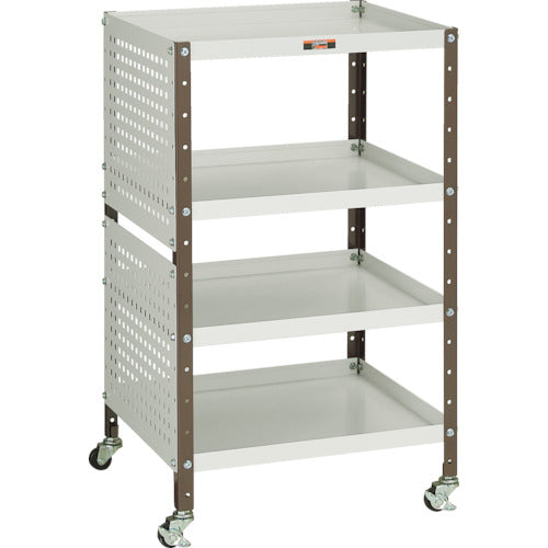 Comes with a punching panel, so a tool hook, etc., can be installed for use.Max Load Capacity (kg/piece):60Equal Load Capacity (kg/stage):10Color:Neo GrayW x D x H (mm):482 x 420 x 798Number of Stages (stage):4Caster: Flexible Type 40mm(2 pieces), Flexible Type(with stopper)40mm(2 pieces)Fall Prevention Height: 30mmShelf Board Adjustable Pitch: 50mmPunching Panel(410 x 330): 2Main Body: SteelCaster Bracket: SteelWheel: Rubber