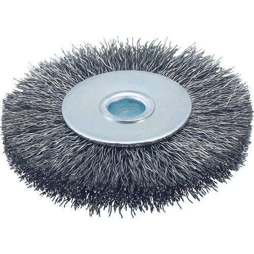 The shape of the brush is a disc type, and hair is planted radially toward the outside.Possible to install as long as a hole is open in the center of a disc-shaped brush and a shaft of the same diameter is attached to a tool, a machine, or the like.Burring of metal surfaces, polishing, cleaning, etc.Outer Diameter (mm):75Wire Diameter (mm):0.3Thickness (mm):12Hole Diameter (mm):10Bristle Length (mm):19.0Max Working Rotation Speed (rpm):3000Compatible with straight grinders
