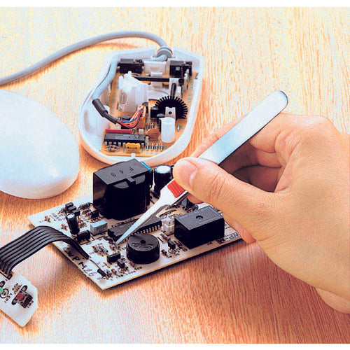 With rubber grip that can apply force to the tip of Tweezers and grab things tightly, it also prevents fingertip slipping.Tweezers are hard to get tired even after long time use.A non-stick fluorine coated item.The tip is strong, it is high strength specification.With a safety cap.Assembling thin parts and precision work.Total Length (mm):115Width (mm):10Tip:Tip thin Eagle TypeStainless Steel (SUS410) (heat-treated product)