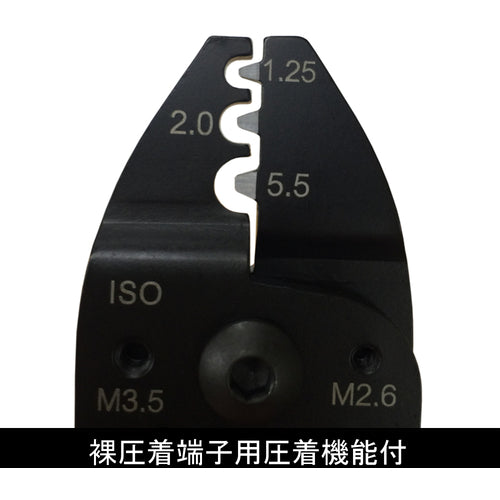 Crimping of bare crimp terminals, stripping of insulated wires, and cutting of cables can be done only with this tool.Cutting of machine screw or bolts is also possible.Outstanding sharpness with the polished-finishing blade part.The unique double-molded is adopted for a grip, and it reduces burden at work.For wiring of machines, automobiles, or electronic tools, crimping works of various crimp terminals, or cutting of small bolts.Crimp Terminal ([[MM2]]) For bare terminal:1.25, 2, 5.5Total Length (mm):225