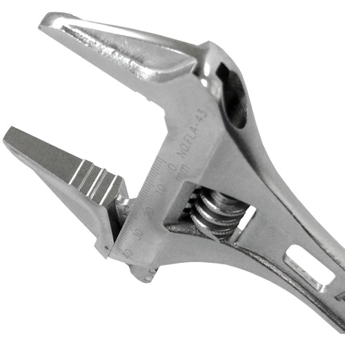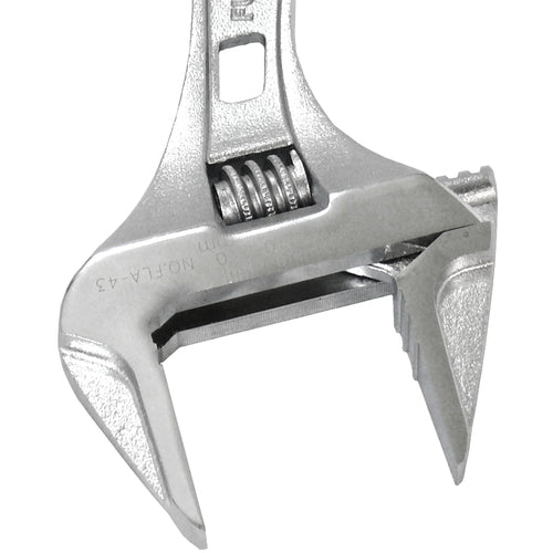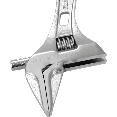Lightweight, thin type, and with wide opening.Optimum for turning various sizes of bolts in a narrow place.Since it is closed up to 0mm, it can firmly pinch even a small item.With a scale.Total Length (mm):256Max Opening (mm):43