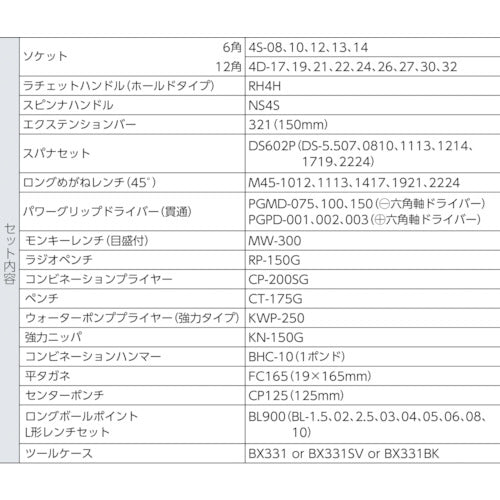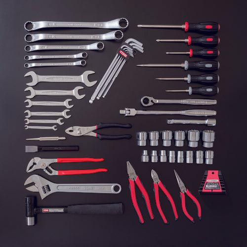 A standard set whose tools are carefully selected and which is suitable for maintenance of various industrial machinery.Case Color:Matte BlackCase Dimension (mm) W x D x H:433 x 220 x 240Set Contents (piece):53