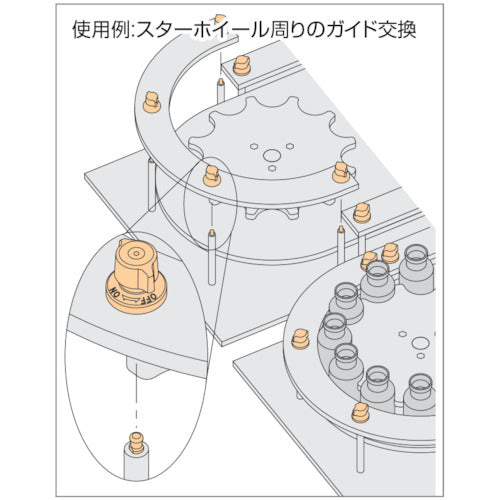 Space saving pin type, ON, OFF are clear.Used in combination with a clamp pin sold separately.d:6D1:14D2:25D3:25H:23H1:6.5M:M2 x 0.4 Depth 3Dimension (mm)Dp:21Body: Stainless Steel(SUS303)Knob: SCS13(SUS304 equivalent)