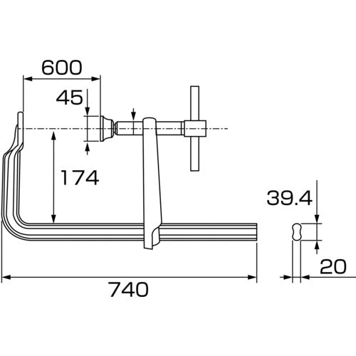 Super strong type of squill vice.As the rail is bigger than the standard type, can be tightened with larger force.The swing angle of the movable jaw is 20degrees.Total Length (mm):740Max Opening (mm):600Throat (mm):174Frame Dimension (mm)A:39.4Frame Dimension (mm)B:20Special Steel