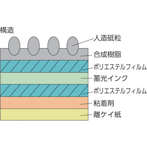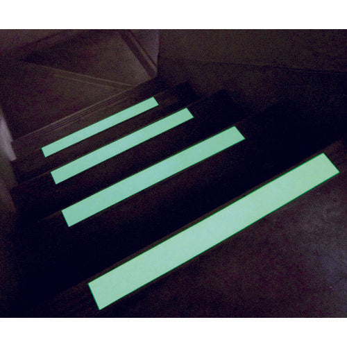 Since uses high luminosity type phosphorescent material, optimum for guidance display etc. in dark place.For outdoor (overall walking place except bare feet)Stairs during lights off, entrance and exit, aisle.Other slippery dark places.Color:GreenW x L (mm x m):50 x 2Thickness (mm):0.6Viscosity: 32N/25mmTensile Strength: 383N/25mmBase Material: Polyester FilmAdhesive: AcrylicsAbrasive Grain: Aluminum OxidationWhen applying to uneven surface, please perform the ground treatment (sealant N3K, sold separately) on the construction surface.