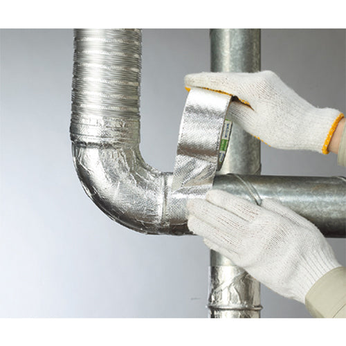 Fits well rough surfaces, and tensile strength is also excellent.For fixing and sealing air-conditioning ducts, warm keeping cases, and glass wool.Color:SilverW x L (mm x m):50 x 10Thickness (mm):0.26Viscosity: 4.12N/10mmBase Material: Aluminum Foil + Glass ClothAdhesive: Acrylics