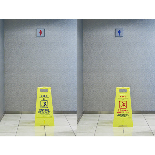 This is a floor sign stand displayed in 4 languages of Japanese, English, Chinese, and Korean.Display Contents:Cleaning/Male workers are cleaning ?I Female workers are cleaning upW x D x H (mm):310 x 329 x 604Double-Sided DisplayColor: YellowMain Body: Polypropylene (PP)