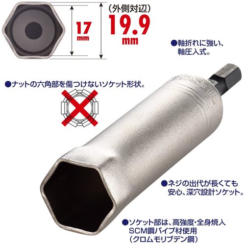 Thin type socket hardly caught when removing from and inserting into a duct channel.With socket shape that makes it difficult for the six corners of nut to get damaged.Deep hole design to reassure even with long screw allowance.Opposite Side Dimension (mm):17Shaft Dimension (mm):6.35Total Length (mm):100Chromium Molybdenum Steel