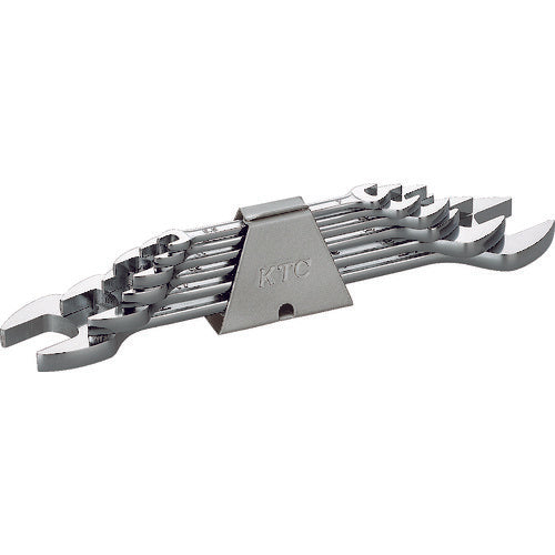 Adopted New Spear Shaped Head to gave volume to the part where force is applied, head width is made as small as possible as compared with the conventional style[[R1]] By adopting a cross section structure, it is lightweight and strongly tough.Size indication is a forged embossed stamp which is large and easy to see.Set Contents (mm):8 x 10, 10 x 12, 11 x 13, 12 x 14, 14 x 17, 17 x 19Set Contents (piece):6Spanner Holder