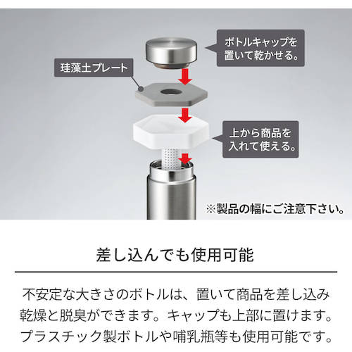 If the size of the bottle becomes unstable when covered, you can stably dry and deodorize it by inserting Bottle Dry while it is still in place.
