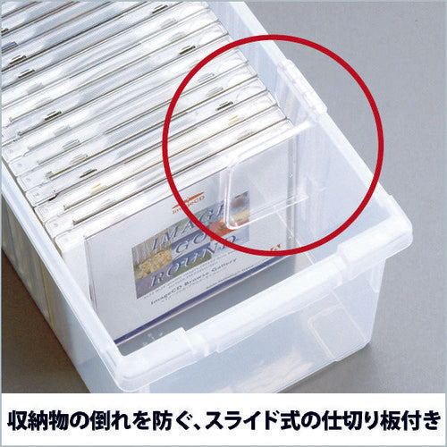 Transparent type so you can see the contents even from the outside.Best suited for organizing equipment and parts.The lid with a lock keeps the contents inside even when the box falls.Rotating lid mechanism and casters are available in the wide type.Capacity (L):22.0Color:ClearOuter Dimension (mm) W x D x H:425 x 465 x 170Effective Inner Dimension (mm) W x D x H:390 x 395 x 140Lid/Main Body/Buckle: Polypropylene(PP)Partition panel: Styrene resinCaster: Polyethylene(wide type only)Partition panel