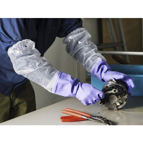Since the glove parts are made of vinyl chloride, they are more resistant to oil and detergents as compared with natural rubber gloves.Since the total length is 65cm, they prevent your hands and arms up to your shoulders from getting wet or stains.With hoods with mesh containing thread, they are durable and hard to be torn.Feel soft and can be smoothly put on/off because of the flocked back fabric.Color:VioletSize:LTotal Length (cm):65.0Around the Palm (cm):22.8Middle Finger Length (cm):7.9Thickness: Approx. 0.54mmGlove: PVC resin, Rayon, CottonCover Part: Polyvinyl chloride resin with nylon yarn