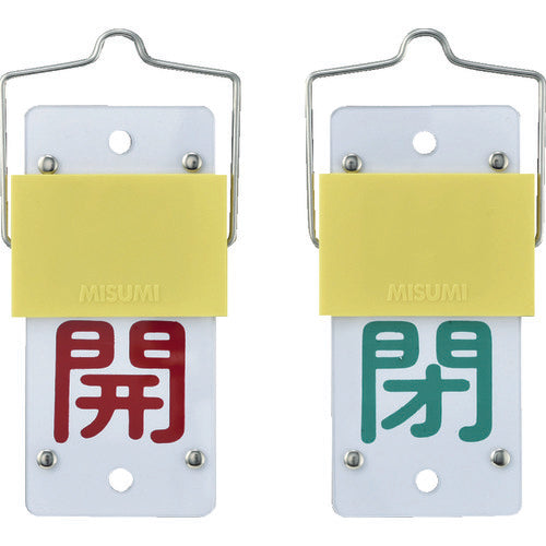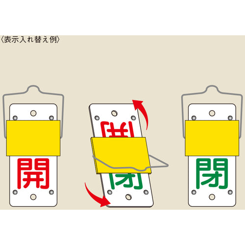 The display switches by rotating the tag up or down and is ideal for displaying valves that open/closes frequently.Display Contents:Open(red letter)/closed(green letter)L x W (mm):130 x 60Thickness (mm):3Hole specifications:7mm hole x 2Double-sided displayMain body: Hard polyvinyl chlorideMounting metal fitting: Stainless steel