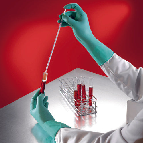 Since no latex is contained, they are suitable for prevention of type I hypersensitivity.Since they are free of powder, the risk of dermatitis is reduced.Provide excellent resistance to acid, base and alcohol.Texture-processed fingertips are hard to slip even in wet and dry conditions.Polyurethane inner coating makes it easy for you to put them on/off.Color:GreenSize:MTotal Length (cm):28.5Around the Palm (cm):19.0Middle Finger Length (cm):8.3Thickness: 0.13mmDual Purpose for Left and RightAQL(acceptable quality level): 1.5ASTM F 739(JIS T 8116)test data availableNeoprene Rubber