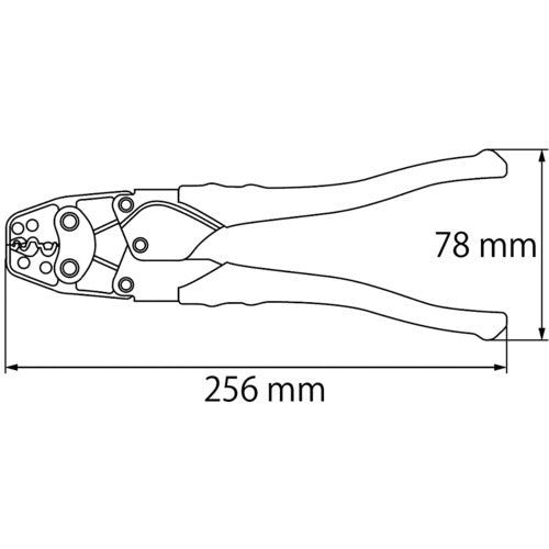 Weighing only 400g, handling operation is by far the lightest.Mold confirmation mechanism is built in.JIS C9711 Compliant Product.Crimps and connects the cable with a bare terminal or sleeve.Crimp Terminal ([[MM2]]) For bare terminal:1.25, 2, 3.5, 5.5, 8Total Length (mm):256