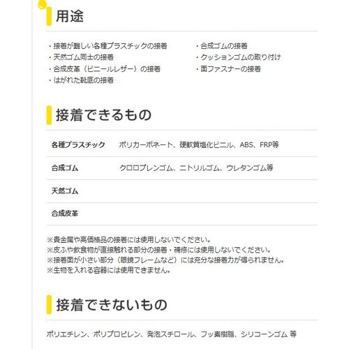 ●Excellent in adhering each of hard to bond various plastic, synthetic rubber, and natural rubber and adhesion of these materials to leather, wood and metal.●Adhesion of various plastic and synthetic rubber.●Color:White Translucent●Capacity (ml):20●Principal Component: Urethane Plastic●Brush for coating●Sand paper