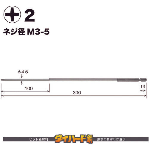 A thin shaft type convenient for performing work in tight space.Color printing is applied on all of hexagonal surfaces, and it does not have a blurred part like painted products and has sharp edges.(excluding the total length of 200/300m)High fitting property was realized due to elaborate processing of blade edge.Uses Die Hard Steel(highest hardness HRC62)as the bit material.Color:NoneBlade Edge:[[+]]2Total Length (mm):300Shank Diameter: 6.35mmBlade edge: With magnetCompatible with 18V impact.