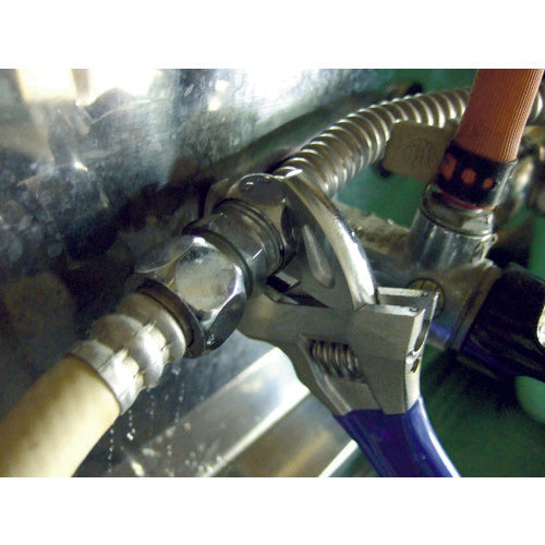 Short type.With a convenient finger-hook function.It is optimum for narrow places since there is no protrusion at the jaw even fully opening.Total Length (mm):117Opening (mm):7 to 26Chrome Vanadium Steel (Cr-V)Pursuit of compactness, mouth does not close to the end.