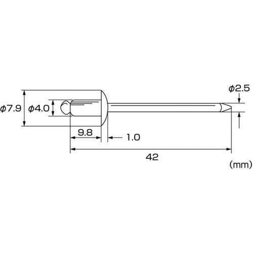 Multiple base metal can be fastened from one side with one action. Compared with welding, there are merits to labor saving of work and improvement of productivity.Automobile sheet metal, electrical sheet metal, etc.Caulking Board Thickness (mm):3.2 to 6.4Rivet Length (mm):9.8Flange Diameter (mm):7.9Rivet Diameter (mm):4.0Pilot Hole Diameter (mm):4.1 to 4.2Shear Load (N):3400Tensile Load (N):3950Packaged in a boxRivet main body(flange): Stainless steel (SUS305)Mandrel(shaft): Steel(carbon steel)