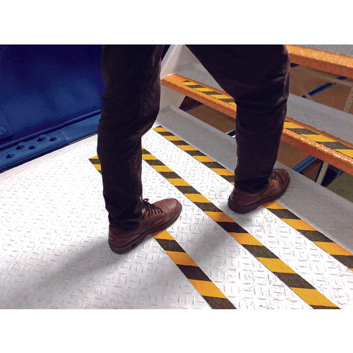 By simple construction, slip prevention measure can be implemented.For indoor/outdoor dual purpose.Color:Yellow/BlackW x L (mm x m):50 x 5Thickness (mm):1Viscosity: 15N/20mmAdhesive: AcrylicsAbrasive Grain: Mineral Particles