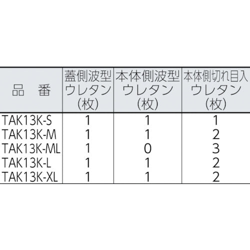 A resin tool case with high durability and sealability, so it is optimum for storing and transporting precision machinery.Cushioning material of corrugated die urethane (soft) and urethane with cut (hardness) firmly guards stored items from impact .Urethane with cut possible to easily make a drawn shape according to the stored items.Lid Corrugated Die Urethane Size W x D x H (mm):182 x 120 x 10Main Body Side Corrugated Die Type Urethane Size W x D x H (mm):188 x 124 x 43Urethane with Cut on Main Body Side W x D x H (mm):188 x 124 x 22Waterproof TypeCylinder Lock Attachable (sold separately)TAK13K-ML only urethane on the main body side (break with/without) There are 2 typesMain Body: Polypropylene (PP)Cushion: UrethaneBuffer UrethaneShoulder belt(L/XL size only)